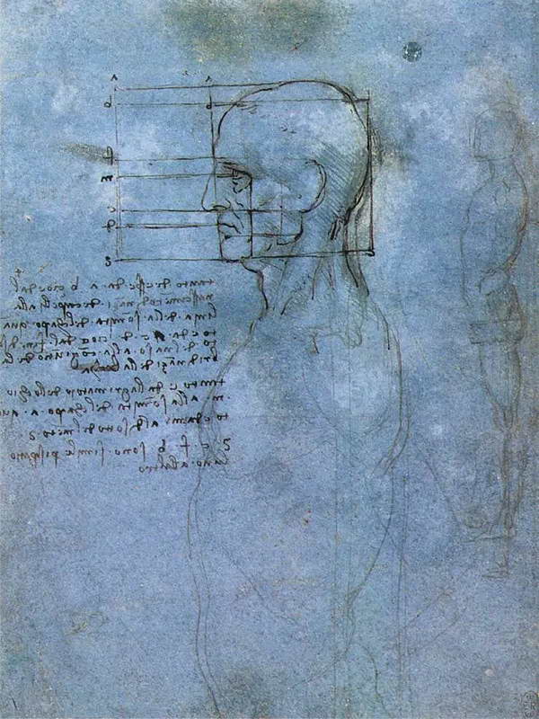 26. Пропорции головы в профиль. Около 1488. Рисунок пером по наброску серебряным штифтом на голубой грунтованной бумаге. Виндзор. Королевская библиотека.