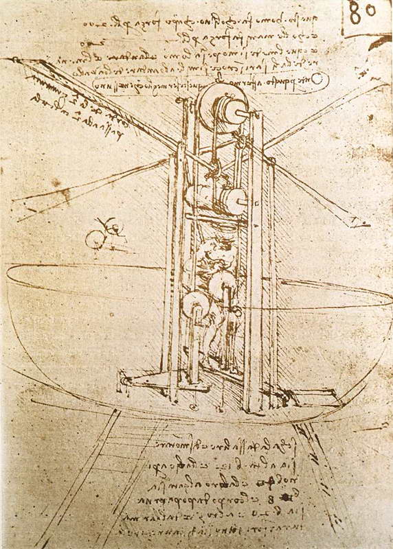 «Он делал, — говорит Вазари, — рисунки мельниц, сукновальных машин и приборов, которые можно было пускать в ход силою воды». Какие приборы, действующие силою воды, имелись тут в виду, не очень ясно. Нужно думать, что они имели отношение к шерстяной промышленности, так как мастерские Ланы и Калималы находились почти сплошь на берегу Арно: в первоначальных процессах производства требовалось много воды для промывки шерсти и сваляной грубой материи. Но Вазари перечисляет далеко не все. Тетради Леонардо, в которых так много места отведено искусству, пестрят проектами валяльных, стригальных, прядильных, ткацких и иных машин, и в каждой, как утверждают специалисты, всегда есть здоровая изобретательская мысль и есть определенное улучшение по сравнению с тем, что фактически служило в то время производственным процессом. Там имеется, между прочим, проект механической прялки, рядом с которой прялка Юргена, изобретенная в 1530 году и служившая текстильной промышленности до конца XVIII века, кажется грубой и непродуктивной. Но ни один из Леонардовых проектов никогда не был осуществлен.
