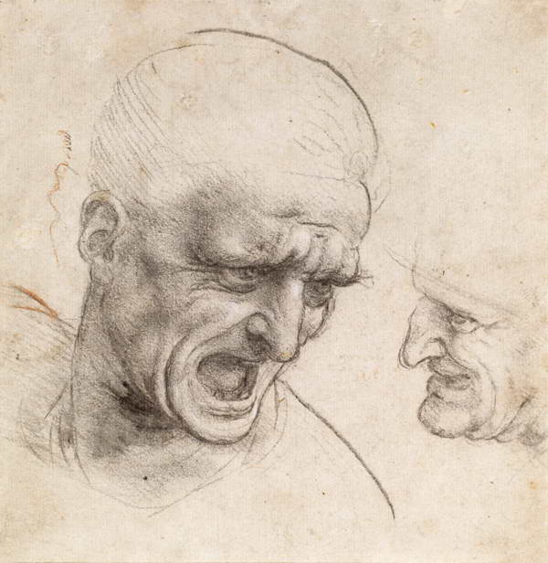 44. Этюды голов воинов для «Битвы при Ангиари». 1503. Рисунок итальянским карандашом. Будапешт. Национальный музей.