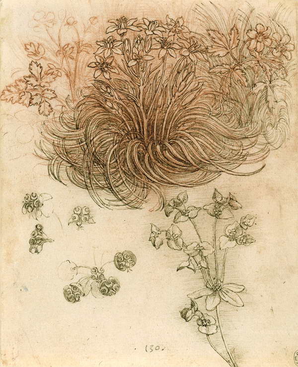 46. Ботанические зарисовки: «звезда Вифлеема» и другие цветы. Около 1505–1508. Рисунок пером по наброску сангиной. Виндзор. Королевская библиотека.