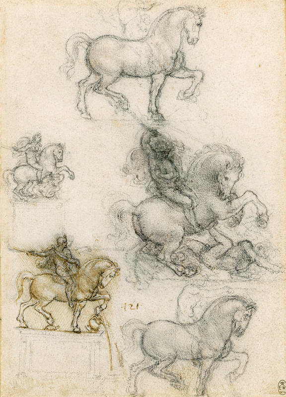 53. Эскизы для конного памятника маршала Тривульцио. Около 1510. Рисунок свинцовым штифтом и частично пером на грунтованной бумаге. Виндзор. Королевская библиотека.